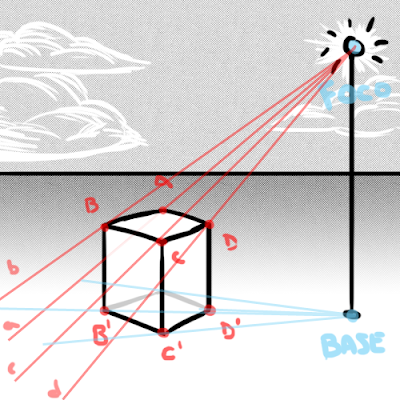 Lo primero que tenemos que hacer, una vez determinado el objeto y el foco de luz, es situar los puntos clave del objeto para tomar como referencia. El cubo va a tener un punto por cada vértice (8 puntos en total, A, B, C y D; A’, B’, C’ y D’), el foco tendrá un punto llamado (FOCO) y su base (lo que sería el pie de una farola) tendrá otro punto (BASE).