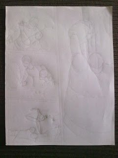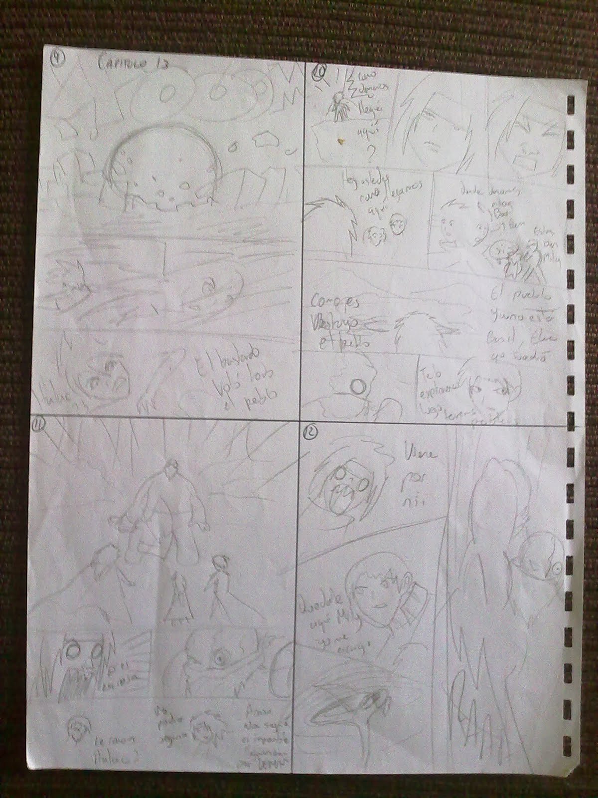 - Ya que tenemos nuestro storyboard con la composición de la página comenzamos con el dibujo. Comenzando con los bocetos de los personajes y los fondos.