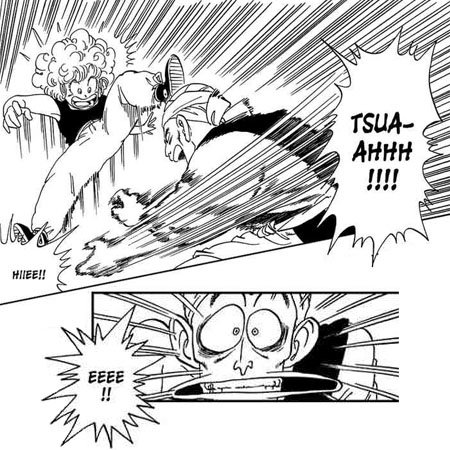 • Globos estrellados: Son aplicables a estados fuertes de emoción del personajes, generalmente en los gritos. Se lo representa de dos formas generalmente: La primera, similar a una estrella de varias puntas, formada con líneas rectas, que pueden ser uniformes o multiformes. La segunda, de la misma manera pero con líneas curvadas. En la siguiente imagen, sacada de una misma página del manga de Dragon Ball, podemos apreciar las dos situaciones.
