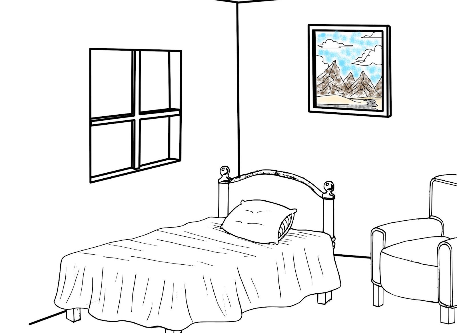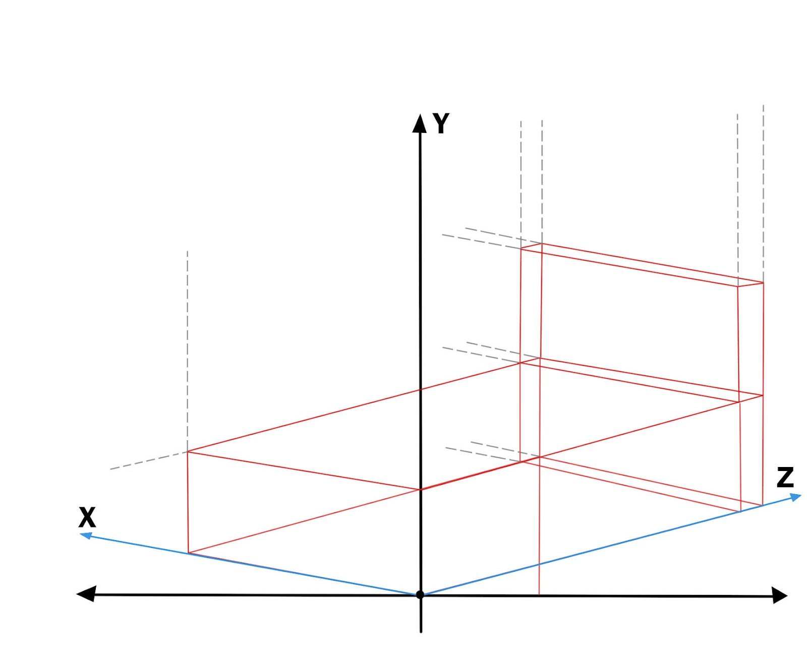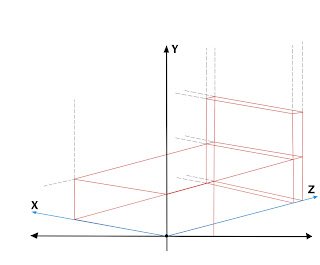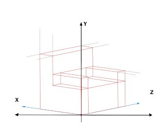 • Como podemos observar en el dibujo anterior alteramos los ejes X y Z, los trazamos por debajo de la linea base horizontal para dar la ilusión de profundidad en una recámara, usando líneas guias podemos construir objetos como ventanas o recuadros y podemos obtener algo como el siguiente dibujo: