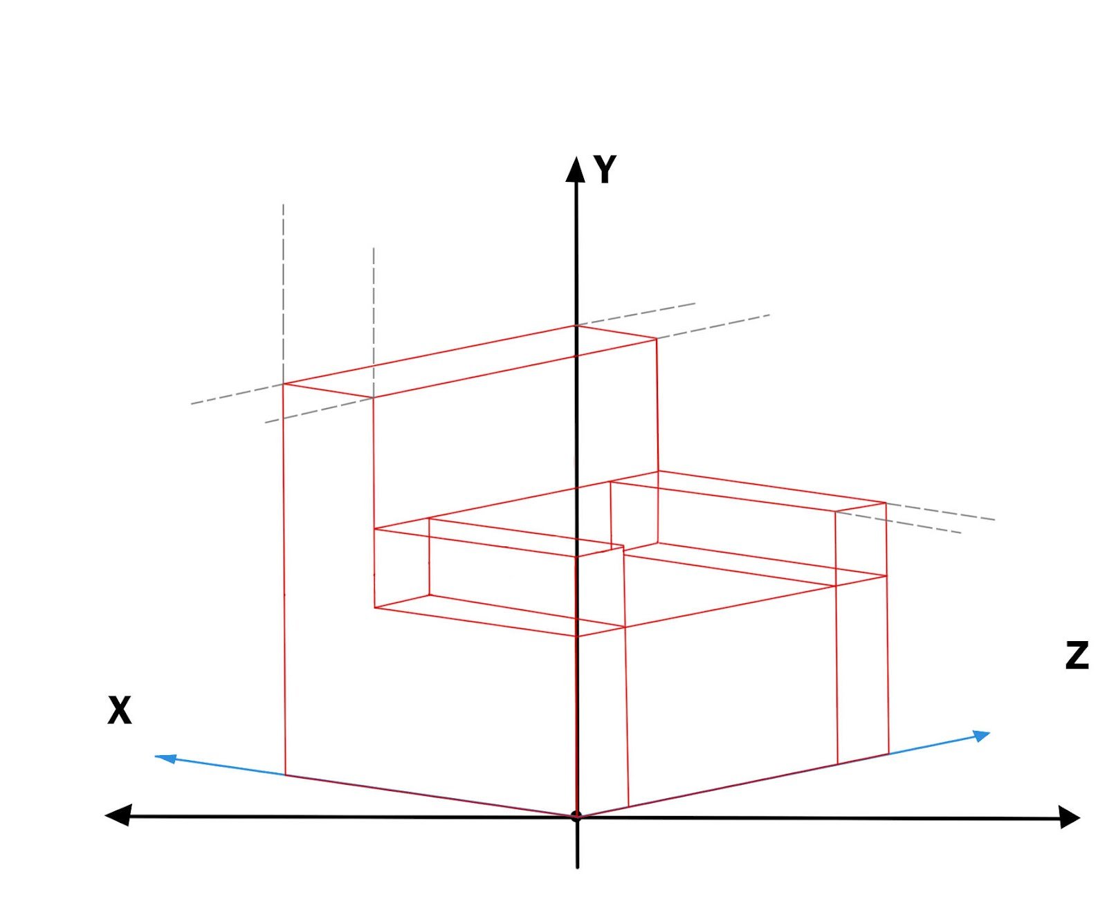 • Posteriormente trazamos las líeneas base del dibujo, las cuales serán perpendiculares al eje X y el eje Z. Podemos construir objetos sencillos desde cubos hasta formas mas complejas. Aquí se muestran dos ejemplos de cuerpos isométricos: