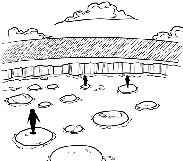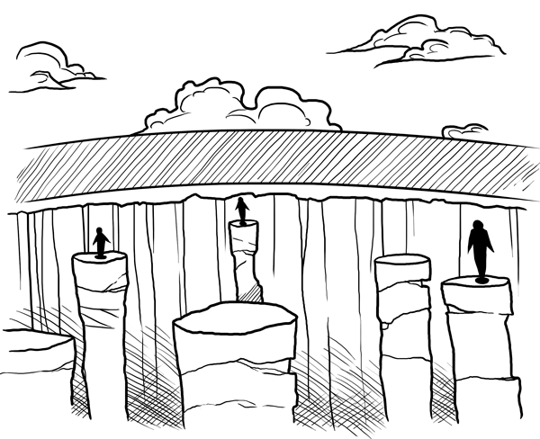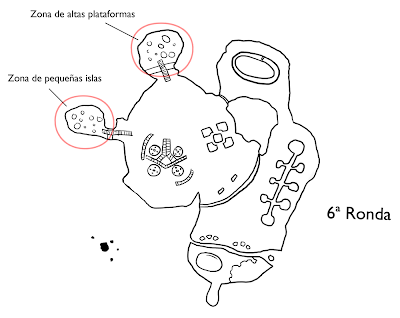 Sobre los escenarios, cada grupo se ha ido por un sitio distinto. Los que luchen contra Rojo deben saber que su escenario será un sitio peligroso. Escondido dentro de un muro negro hay un lugar en esta isla que parece la misma entrada al infierno. Es un pozo que aparenta no tener fondo, con unas plataformas elevadas sobre las que os tendréis que tambalear. Ciudado, no parecen muy estables. Aquí el boceto: