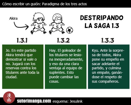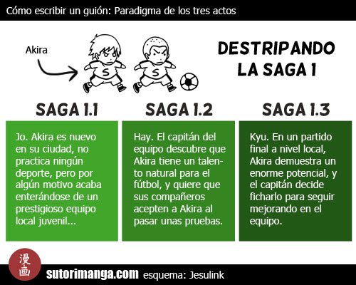 Vamos a tomar como referencia un manga spokon (deportes) muy normalito, visualizándolo en tres sagas y descomponiendo una de ellas para ayudarnos a llegar antes a la escritura del guión. Aquí está el manga:
