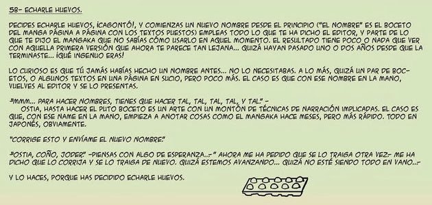 EliminarDe hecho, en tu primera visita a un editor tienes que llevarle unos cuantos mangas terminados, y a ser posible autoconclusivos, que él descartará alegremente uno por uno. Sólo cuando has sido aceptado, has despertado el interés de la editorial y/o te han publicado ya alguna vez puedes empezar a llevarle nombres en lugar de mangas.