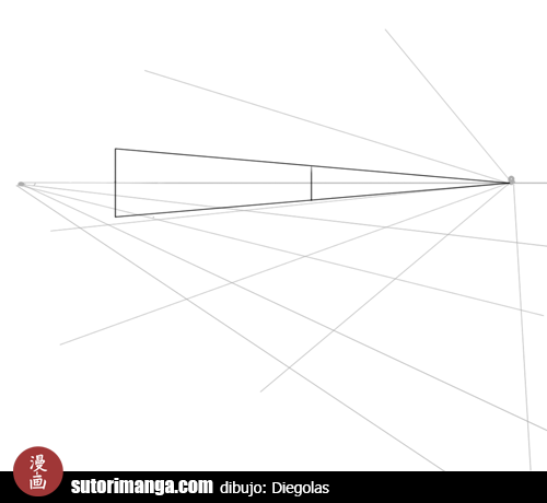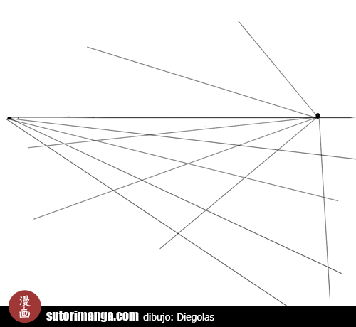 Creamos una línea imaginaria que simula el horizonte del dibujo, esta por supuesto no se ve en el dibujo final. Luego dibujamos dos puntos de fuga, una recomendación particular para este caso sería el tener estos dos puntos de fuga algo alejados entre si. Podemos probar nuestos puntos de fuga trazando algunas líneas que nos servirán de guía para lo siguiente.