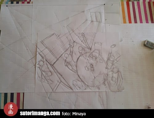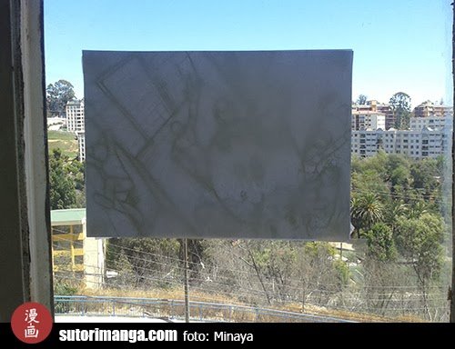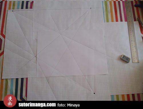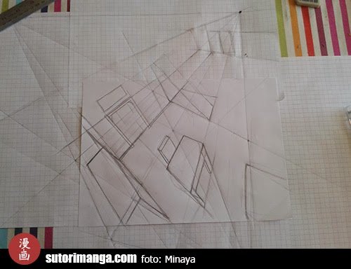 La idea es que la hoja blanca sea donde estará nuestra ilustración y las hojas cuadriculadas serán nuestras ayudas para dirigirnos con los puntos de fuga, como también se ve en la imagen.