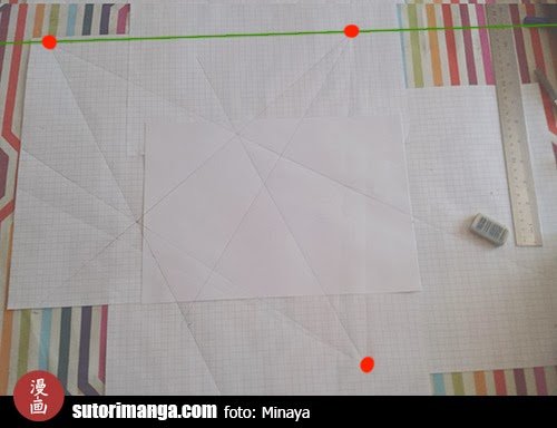 Marcar los puntos de fuga, eso lo hacen a gusto. Para esto las hojas cuadriculadas nos facilitarán el trabajo, junto con una regla, preferentemente larga. Si no los ven en la anterior imagen los que hice, se los dejo mejor marcados acá: