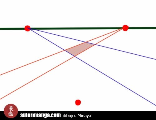 En verde tenemos el horizonte y en rojo los tres puntos de fuga. Piénselo así, los dos puntos de fuga que están en el horizonte es como se verían las líneas en un mismo plano el que esta afuera atrae las líneas que traspasan de un plano a otro. O mejor dicho, el punto que esta fuera de la línea de horizonte representa las líneas de la altura. Intentemos verlo gráficamente.