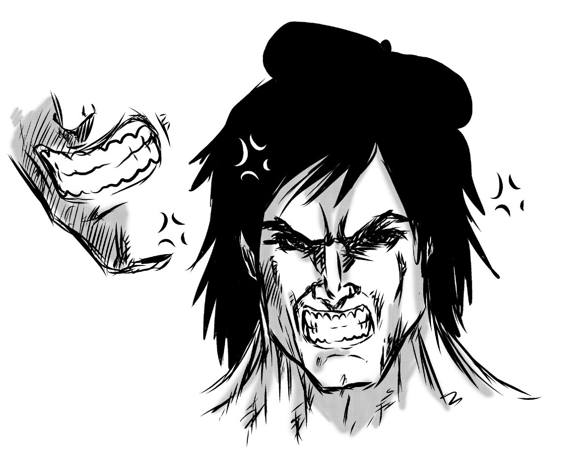 4) Dientes rudos: Estos dientes son más estéticos que los anteriores y mas que dibujar de una manera en particular los dientes, lo importante de este tipo de dentadura es la aparición de la encía de cerca de las muelas. Ese es el mensaje universal de estar muy pero muy cabreado. Les recomiendo al usar este tipo de dientes el poner especial atención en los detalles en las muelas los cuales le pueden dar una expresión aún más bestial a su personaje.