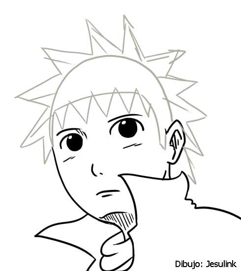 Dirección del pelo. Lo siguiente es establecer la dirección del pelo con unas guías. ¿Hacia dónde va el pelo del personaje? ¿Cae? ¿Está de punta? Un cabello estándar de héroe Shonen es el cabello en forma de estrella, que nace desde la coronilla y va cayendo hasta el flequillo o hasta la nuca, respectivamente. Fijaos en las pequeñas marcas que delimitan la caída del pelo. Ahora veréis cuántos pelos podemos sacar de esta guía...